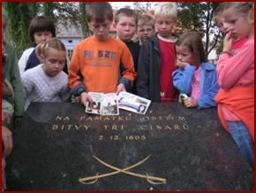 Přímo v rukou odborníka jsme se ocitli při prohlídce Mohyly míru, památníku, který byl před sto lety postaven na památku padlých v bitvě poblíž Slavkova. Nejprve jsme si v muzeu shlédli a vyslechli zajímavou ukázku. Díky digitální technice jsme se přímo stali účastníky bitvy. Figuríny císařů v životní velikosti, autentické zvuky, opravdové suvenýry z bojiště – to vše jsme vnímali s otevřenou pusou. Zajímavostí stavby Mohyly míru je její klenutá klenba, která nějakým zázrakem umožňuje si šeptem povídat z rohu do rohu. Což si všichni děti musely vyzkoušet. Nakonec jsme dostali a koupili suvenýry pro naše kamarády na Slovensku, aby i oni aspoň trošku ochutnali atmosféru tak velkolepé bitvy. |