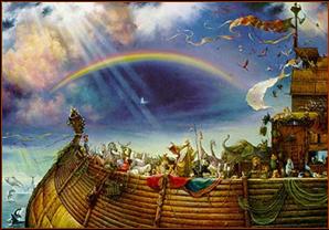 Sú tri hodiny a do triedy s úsmevom a plný elánu vstupuje pán farár. Je tu nový, ale stačilo málo a deti si získal svojim priateľským prístupom a veľkým kusom ľudskej tolerantnosti a otvorenosti. Tento rok deti čaká prvé sväté prijímanie a tak je rád, že sa môže s nami zblížiť a stať sa súčasťou toho, čo nás už prvej triedy drží pohromade. Pripája si svoj projektor na diapozitívy a do rúk berie bibliu. Rozpráva nám všetkým o tom, ako vznikol život, ako prišlo na svet dobro, ale hriech. Na bielej tabuli sa nám spolu s jeho rozprávaním objavuje náš hrdina Noe. Stojí vo svetle dobra a Boh mu prikazuje postaviť koráb presných rozmerov. Spolu so svojimi synmi sa púšťa do práce a nevšíma si, ako sa iní vysmievajú a snáď i považujú za blázna. On však i v ťažkých chvíľach zotrvá vo svojej viere, že mu Boh chce dobre a postaví koráb s troma poschodiami, vytretý smolou zvnútra a zvonka. Zozbiera všetky zvery v páre a so svojou rodinou vchádza od archy. |