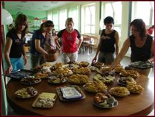 My sme všetko zvládli vďaka tomu, že každý priložil ruku k dielu, ako vedel. Jarmila telefonovala a vybavovala, ako len mohla. Valika nakupovala a zabezpečovala všetko potrebné. Danka listovala v kuchárskych knihách, Ľudmilka zháňala prasiatko a kuchára, Zuzka pripravovala kultúrny program a zabezpečovala všetko potrebné ... a ja? Snažila som sa to všetko nejako dať dohromady, aby každý vedel, čo treba urobiť a kedy. Vďaka pomoci všetkých rodičov a priateľom sa stoly prehýbali dobrým jedlom, koláčmi a zákuskami ako na svadbe. |