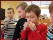 Súťaž prebiehala veľmi úspešne. Už od pondelka začali deti s ovocím od raňajok. Na desiatu k svojim rožkom či chlebíkom deti mali priložené ovocie miesto sušienky či inej sladkosti. Spoločne rozdelené pomelo, ktoré som deťom priniesla, na druhý deň spustilo lavínu ovocia a hromadného ochutnávania kadečoho. Miňo priniesol očistené liči, Mária zasa balíček fíg, orechov a jablkový mušt. Maťka a Jakub sa stali špecialistkou na ovocné šaláty ( boli skvelé ). Alex a Jakub priniesli čínsku hrušku, karambolu a kumkvát. Alan zasa priniesol granátové jablko. Deti ma upozorňovali, aby som dala pozor pri prekrajovaní, aby mi nevybuchlo v ruke. Hmmm, nevybuchlo a tak premýšľali, prečo je teda granátové. Prišli sme na to, až keď sme si pochutnávali na jadierkovej dužine, ktorá príjemne chrupčala v ústach. Pani upratovačka mala z nás radosť, lebo sme ostriekali celé umyvadlo a užili sme si aj trocha hororu, keď mi krvavočervená šťava vstrekla do tváre a vlasov a pomaly stekala dolu. Wau..... to bolo vzrušenie! Súťaž priniesla ale aj veľa sebazaprenia. Kto ste dospelí , ani si neviete predstaviť, čo to je nejesť 5 dní žiadnu sladkosť. Vraj je to strašne! Jedno sladké pokušenie na jazyku sa u nás účtovalo odobratím bodu. Objavom ovocia, ktoré ste ešte nejedli, sa zasa odmeňuje prémiovým bodom. Všetko sa zapisuje do Školienkinho ovocného zápisníčka. Evidencia musí byť dôkladná, kto si nezapíše, už bude len po súťaži banovať. |